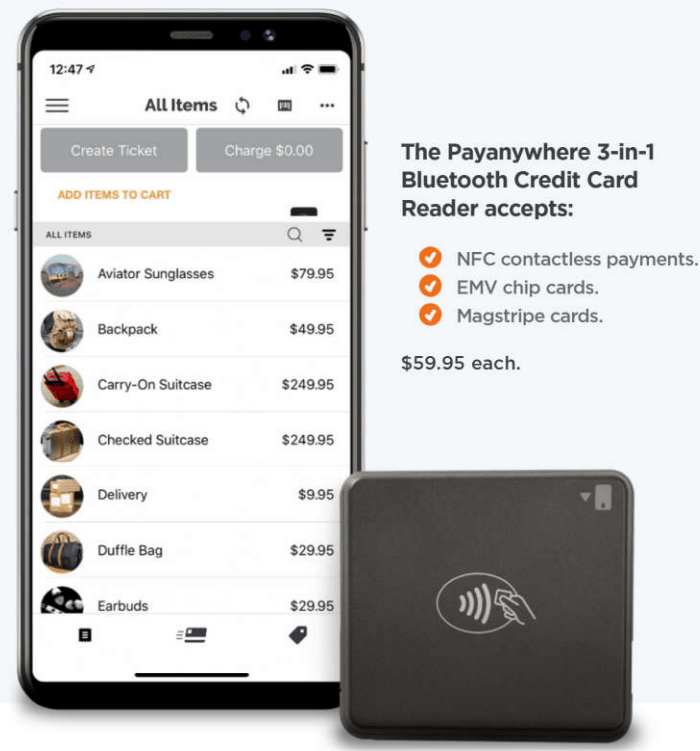 Simply connect this card reader to your phone or tablet and use Payanywhere’s software, you are ready to take payments any time, any place, anywhere. This device allows you to process cards by swipe, chip read or tap. Email receipts to your customers and manage your business transactions. This device is ideal for Professional Services, Health & Beauty, Contractors, Food Trucks and any Mobile Entrepreneur.